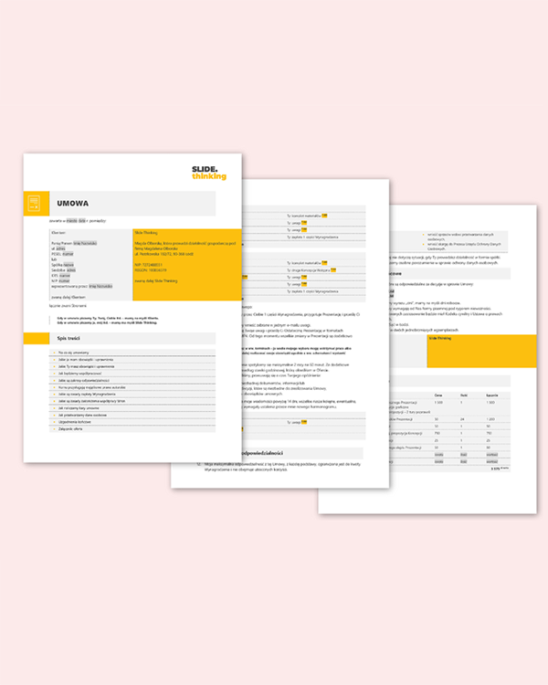 Po zdefiniowaniu problemów projektowych powstał koncept przygotowania krótkiej, Umowy/Zamówienia- w których Strony zaznaczają odpowiednie opcje i rozbudowanej wersji Ogólnych warunków sprzedaży. Umowa jest edytowalna, ma pola do zaznaczania treści i odznaczania opcji. OWS są dokumentem pdf- zaprojektowanym zgodnie z identyfikacją klienta. Dokument jest klarowny, przejrzysty, zrozumiały. Treść zgodna z zasadami prostego języka- użyta formuła My- Ty- która pokazuje partnerstwo, współpracę. Spis treści, wsparcie graficzne, śródtytuły, wyliczenia.